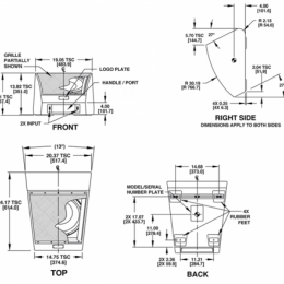 尺寸(英寸/毫米):高度(最小用作舞臺監聽):14.10/357.0,寬度(前):14.75/374.6,寬度(后):19.05/483.9,深度:24.17/614.0