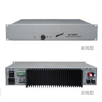 T 系列在的放大器axxent模型恒定電壓分布埃拉系統優化。增加了新的模式AX-1240T T系列和1通道放大器,除了從50 - 100伏的恒定電壓,并且還提供一個低輸出阻抗(Ω) -第七十零 這種廣泛的輸出配置與2 AX 1240T的U和緊湊的設計是非常靈活的。冷卻風扇,太過沉默,仍然提供恒定的工作溫度。當前的工作條件,如電源,目前和過載的危險信號指示光,不同顏色 的指標。唯一的控制是音量調節的輸入靈敏度。 入口配有平衡XLR接口上。恒定電壓輸出保護,防止訪問Schraub-/Klemm- Verbindungen,低阻抗輸出接線柱。對于信號通過一個額外的XLR連接器是可用的。電源開關位于后面板上的IEC電源輸入插座。可拆卸電纜利于 Rackverkabelung。堅固的19英寸2U機架外殼由鋼板粉末涂層前。歐洲廣泛使用的CE認證。