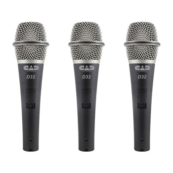 CAD的3包D32手持式動(dòng)圈麥克風(fēng)給你公司的D32超心形手持話筒,用于各種現(xiàn)場(chǎng)應(yīng)用優(yōu)化的三重奏。每個(gè)麥克風(fēng)功能對(duì)身體的On / Off開關(guān)并有權(quán)釹膠囊。