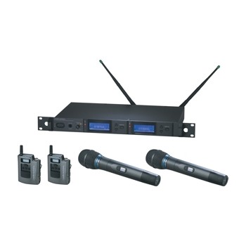 AEW-R5200C雙接收器,雙AEW-T1000aC UniPak發射器和兩個AEW-T5400aC心形電容話筒/發射器。選擇一個無線麥克風要點或電纜來完成系統。
