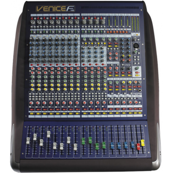 VeniceF-16具有高強度和剛性鋼架。該電位器有金屬軸和單獨螺帽固定在鋼筋膜面板。有在所有輸入通道,團體和大師高精度百毫米推子。儀表板有面漆的涂裝和金屬護角刀片