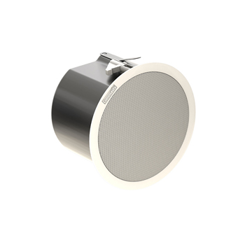 音箱系統將會是兩分頻、全頻吸頂式音箱,帶有6.5英寸低頻換能器還有同軸安裝的3/4英寸開口高頻壓縮驅動單元。驅動連接一個分頻頻率是2kHz的分頻器, 還有一個自復位斷路器以保護驅動。可涂層的音箱障板是由UL 94V-0 ABS 材料構成。后箱體是防腐鍍鋅鋼構造,具有彈簧式dro-StopTM安裝輔助扣。它還包括了隱藏式的終端盒,上面的鎖定連接頭可拆卸,螺栓型端子則為了保護有環通功能的導線終端。夾緊機構將能提供溢放口用于高壓電纜或導管。這套系統的振幅響應是70Hz至13.5kHz(-10dB),低阻抗(8歐)輸入能力是22V RMS。處于1W/1m的靈敏度是91dB SPL(100 Hz到12.5kHz, 1/3倍頻帶)。系統的錐形范圍是120°(500Hz至6kHz ±65°)。標稱系統阻抗是8歐(低阻抗設置中)。系統配備了30W高性能自耦變壓器,在70.7V或是100V的分布式音頻系統中可使用,另外70.7V分布系統中可用30W,15W,7.5W, 3.75W抽頭(100V系統中可用30W,15W,7.5抽頭)。前面的擋板設有一個正面抽頭切換開關,隱藏在可拆卸的網罩里,可以方便的選擇自耦變壓器和低阻抗設置。系統還包括了兩個支撐橋軌和兩個墊片支撐橋軌。它的面板直徑是9.80英尺(248.9mm),箱體深度是6.49英尺(164.8mm),重量為7.1 lbs(3.2kg)。如果音箱要安裝在現存的一個大的后箱體里或是安裝在一個較長直徑為11英寸的(279mm)墻孔中,可選的外殼轉換器/調整環就可以用上了,在干式墻或者石膏到位前,新的構筑支架便可用于安裝音箱系統。