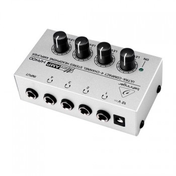 超緊湊 4 路立體聲耳機功放適合所有耳機 – 4 個耳機能同時使用。例如: 在錄音時,您可讓 4 個人聽到主混音,每個人還可以通過音量調節鈕來調節每路的音量。 HA400 配有 4 個高功率立體聲功放。在高音量的情況下,它也有最佳的音色。超低噪音的 4580 運算放大器 (我們 19 英寸的音頻周邊設備也是用同樣的運算放大器) 確保音色嫵媚動聽。隨貨供應 12 直交流電適配器。