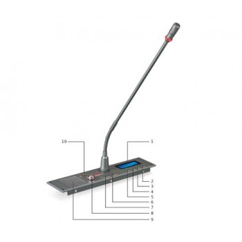 1顯示屏:顯示即時系統狀態 2 ABSTAIN棄權按鍵:表決時按該按鍵表示投棄權票 3 OBJECTION反對按鍵當系統處在表決過程,按該按鍵表示投反對票 4 APPROVE贊成按鍵當系統處在表決過程,按該按鍵表示投贊成票 5 VOTING ON/OFF表決啟動按鍵,這個按鍵允許主席單元啟動表決功能 6 MIC/ON本單元MIC開關按鍵 7 PRIORITY主席優先按鍵,該按鍵啟動則主席單元處于優先或主席強制狀態(根據主機的設置) 8揚聲器音量調節 9揚聲器 10耳機監聽