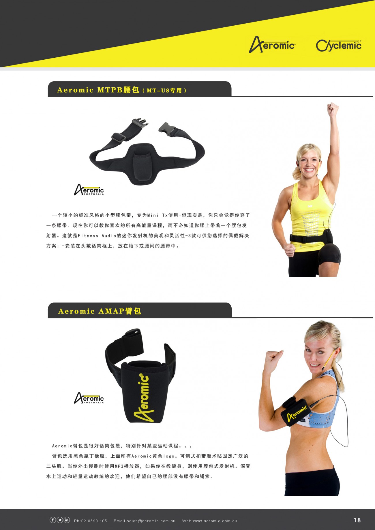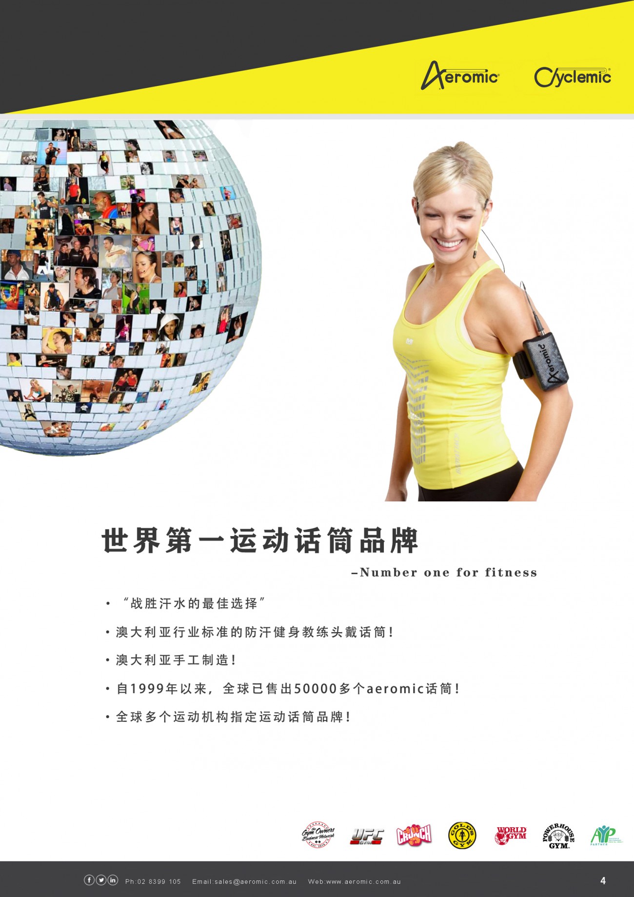Aeromic被譽為“全球第一運動話筒品牌,”提供一系列麥克風和音響設備,用于健身俱樂部音響系統或獨立健身教練的便攜式音響系統。aeromic被認定為“戰勝汗水的最佳選擇”,是澳大利亞行業標準的防汗健身教練耳機話筒,并在澳大利亞純手工制造。自成立以來,全球已售出50000多個aeromic話筒!