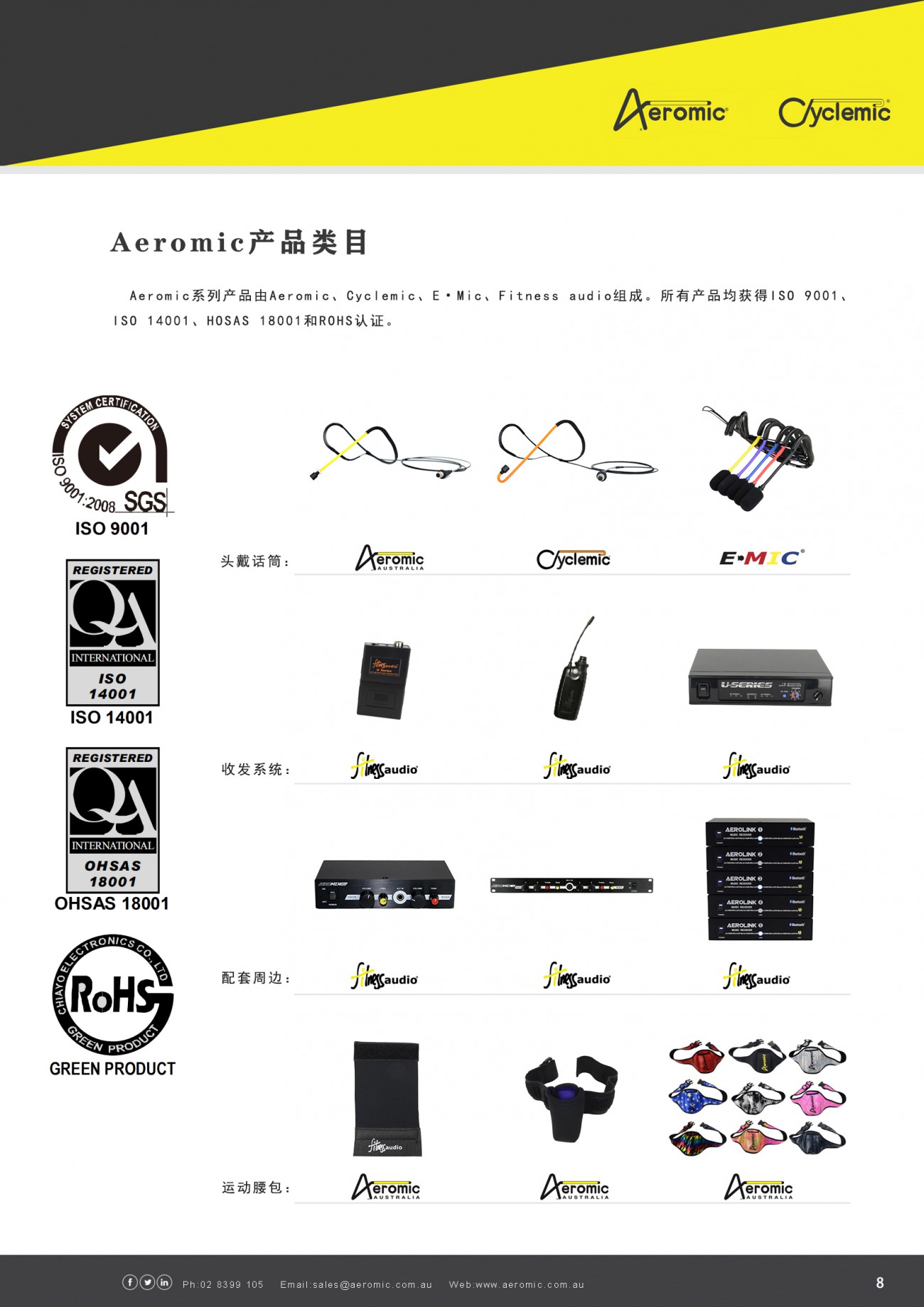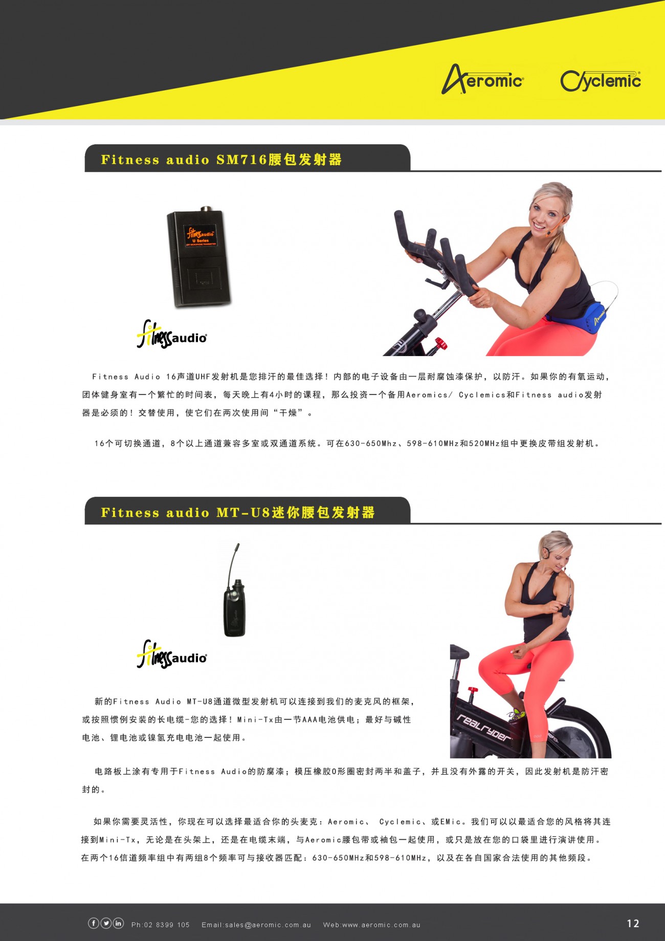 Aeromic Microphones Australia(Aeromic)提供一系列話筒和音響設備,用于健身俱樂部音響系統或獨立健身教練的便攜式音響系統。AMA公司于1994年由約翰·彭哈洛和彼得·佩斯利創立。AMA是在澳大利亞生產的全球領先的Aeromic和Cyclemic話筒的供應商。